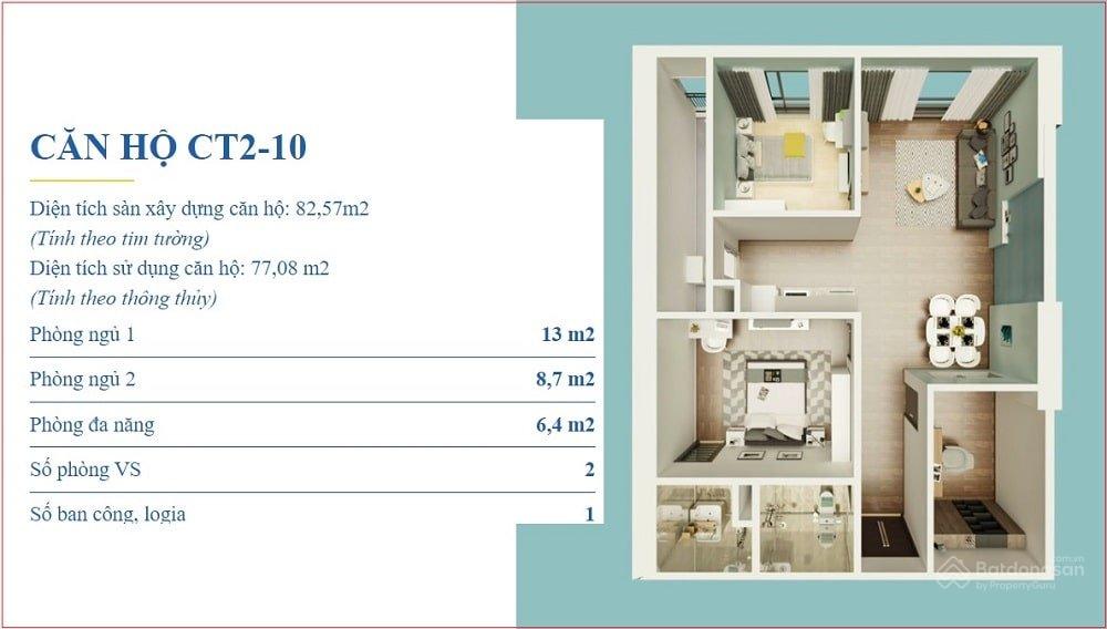 Diện tích: 77m² thông thủy, 85m² tim tường.
